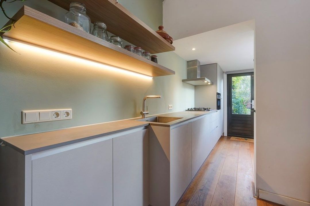 Entree, hal en een lichte woonkamer met open keuken. De moderne keuken beschikt over een royaal werkblad aan twee zijden, een 5-pits gaskookplaat, RVS-afzuigkap, Siemens-oven, vaatwasser, koel-vriescombinatie en ruime opbergmogelijkheden.
