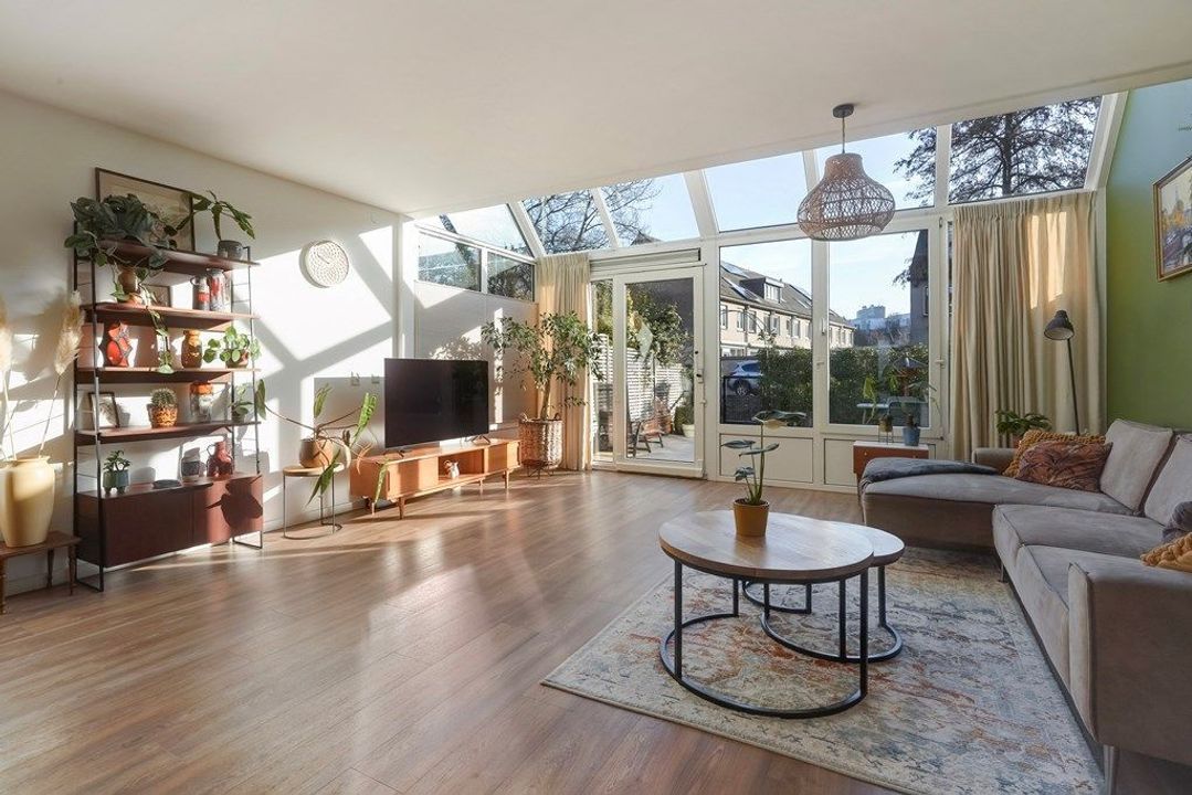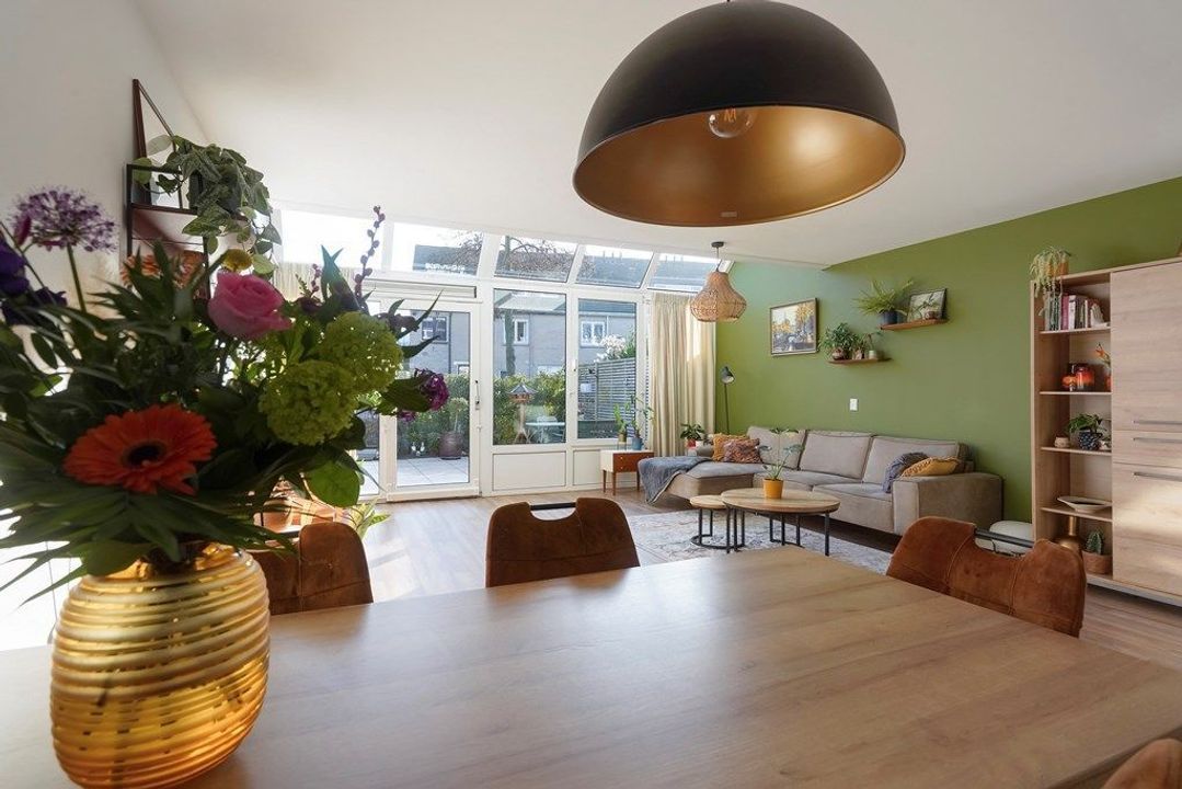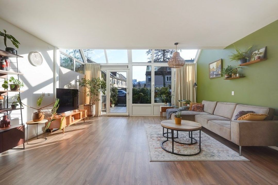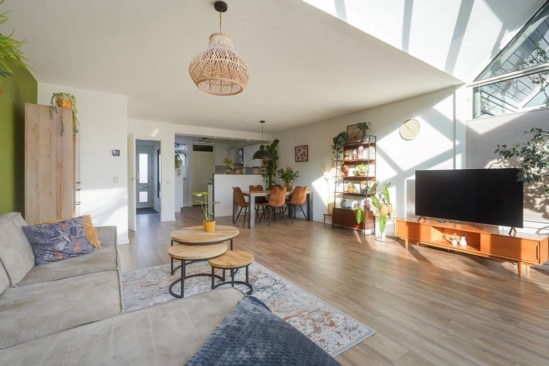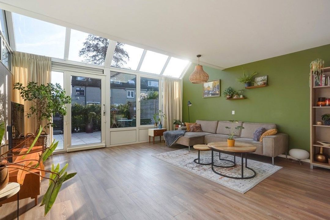 De ruime woonkamer is heerlijk licht dankzij de grote raampartijen en de originele serre met glazen dak. De warme afwerking, houttinten en groene accentwand zorgen voor een gezellige en uitnodigende sfeer. Via de openslaande deuren is er direct toegang tot de achtertuin, waardoor binnen en buiten naadloos in elkaar overlopen.