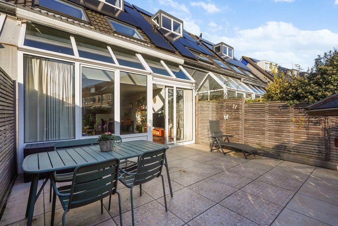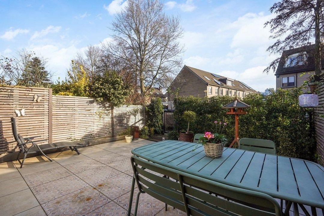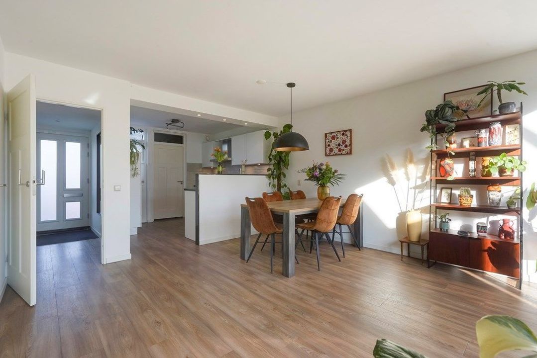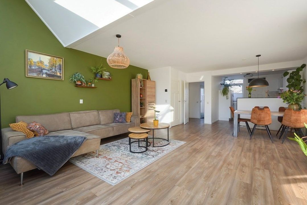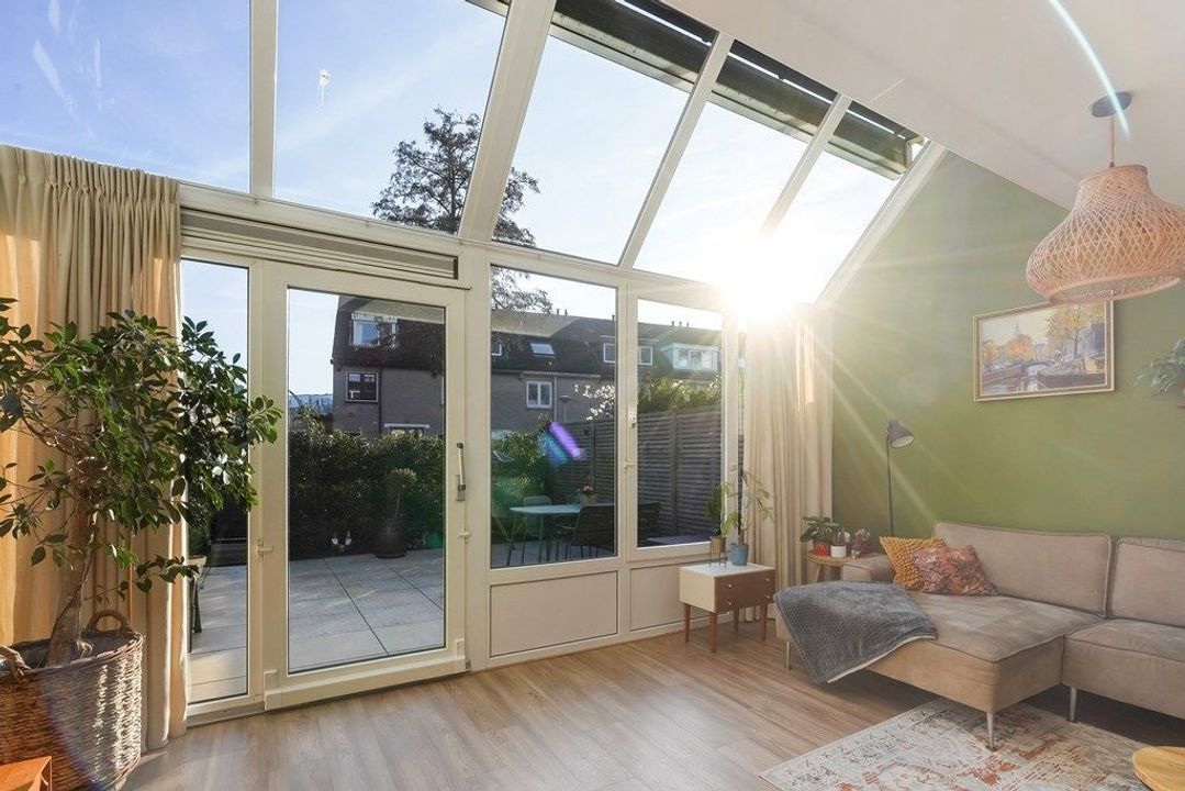 De ruime woonkamer is heerlijk licht dankzij de grote raampartijen en de originele serre met glazen dak. De warme afwerking, houttinten en groene accentwand zorgen voor een gezellige en uitnodigende sfeer. Via de openslaande deuren is er direct toegang tot de achtertuin, waardoor binnen en buiten naadloos in elkaar overlopen.