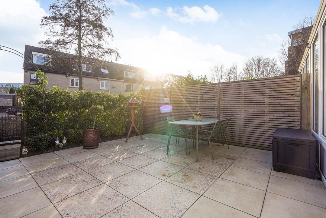 De zonnige achtertuin beschikt over een ruim terras, biedt veel privacy en ligt direct aan het water met een eigen vlonder – een heerlijke plek om te ontspannen en van het buitenleven te genieten.