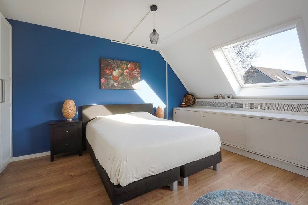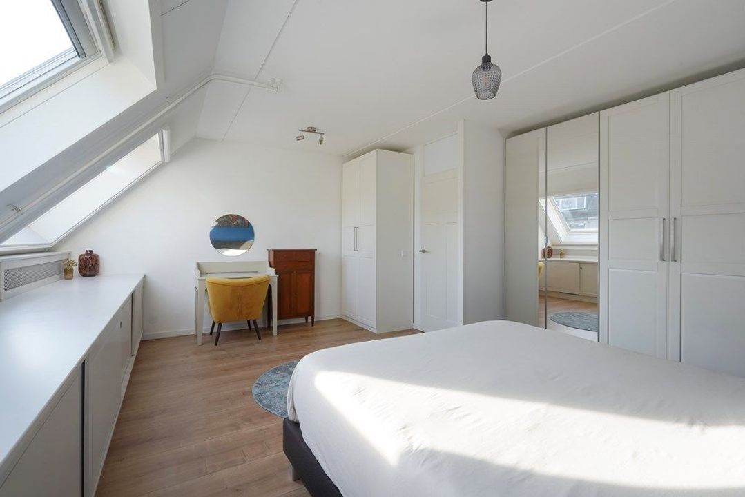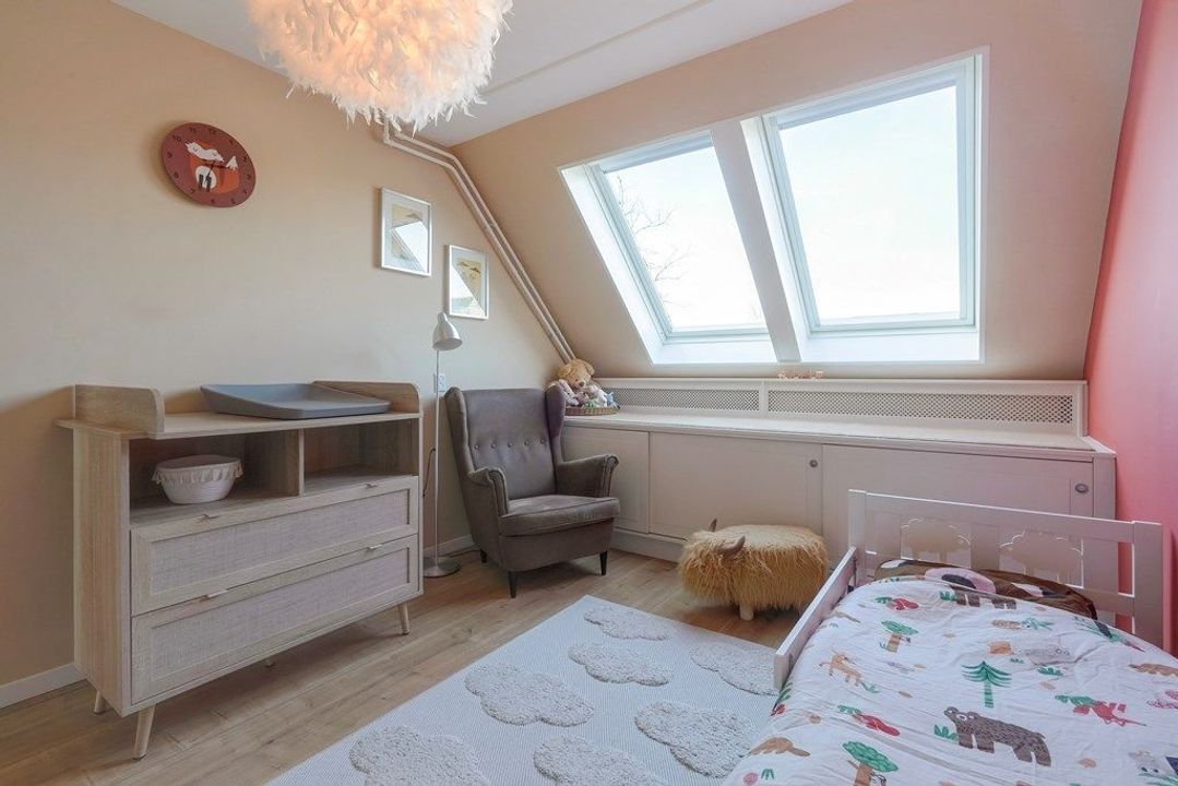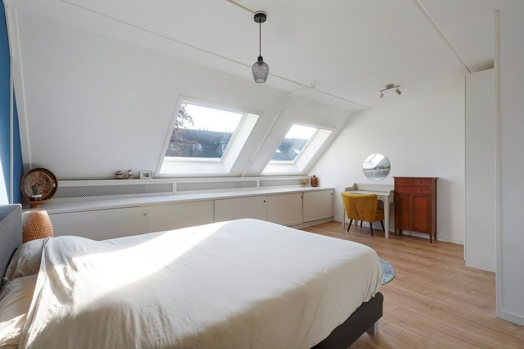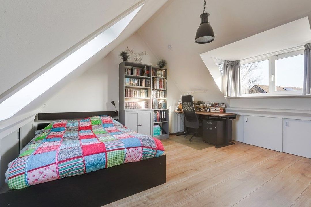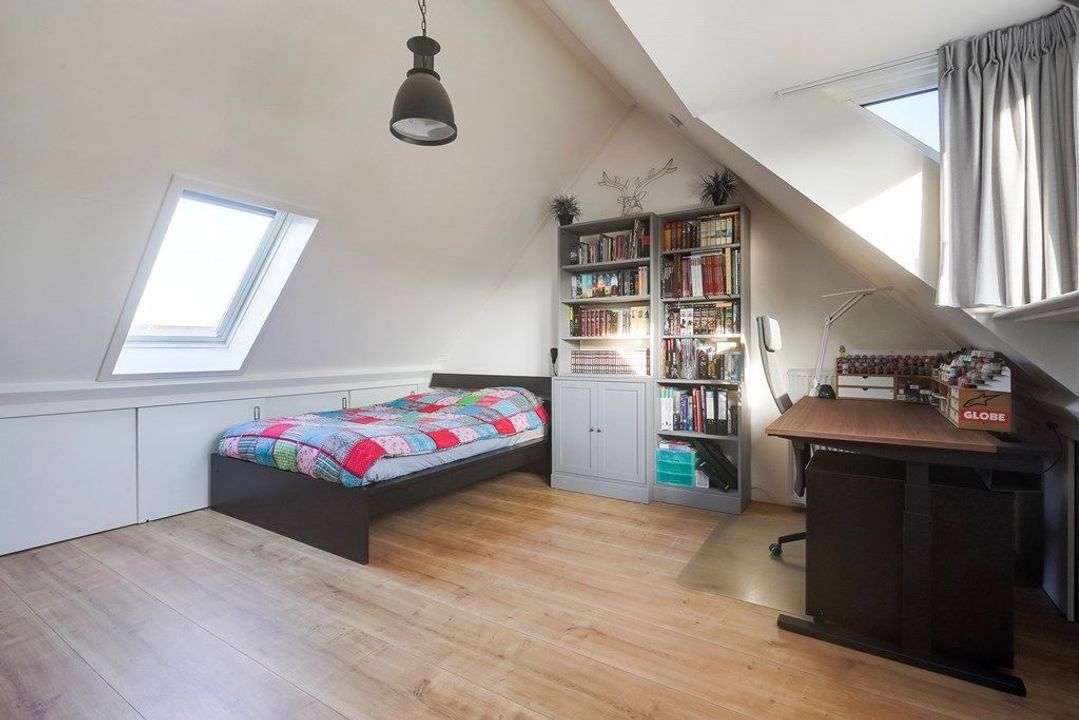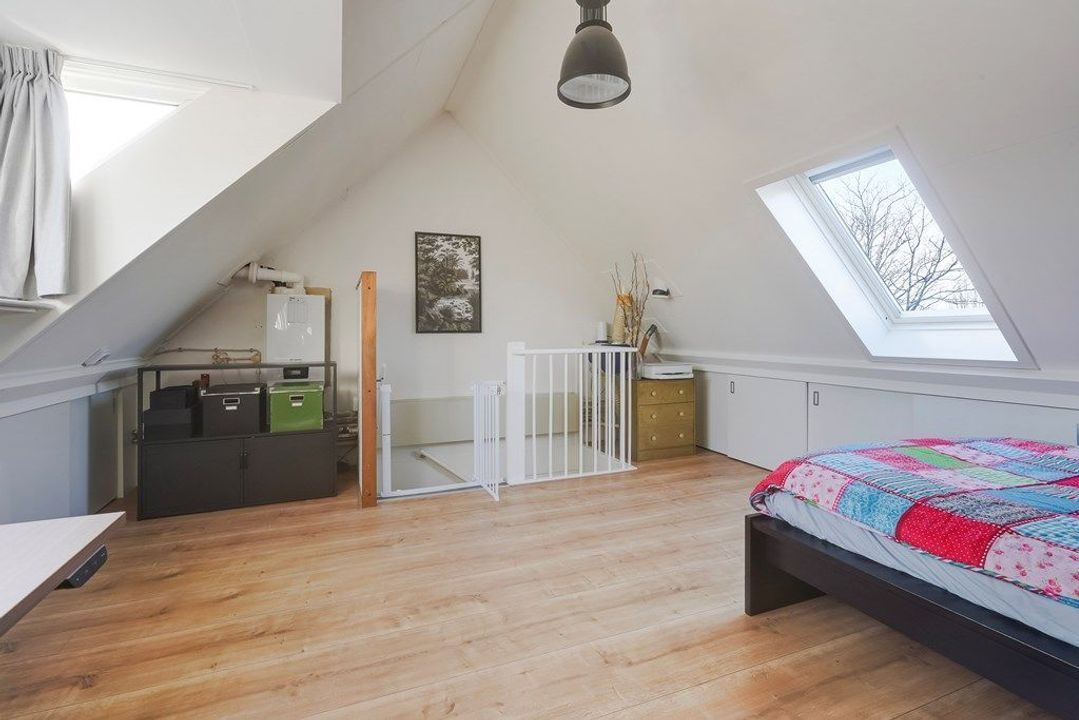 De royale zolderkamer is licht en veelzijdig, met een prettige plafondhoogte en meerdere dakramen. Een rustige ruimte die uitstekend geschikt is als extra slaapkamer, werkruimte of hobbykamer.