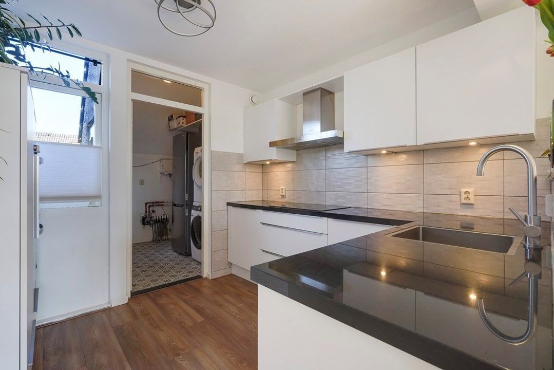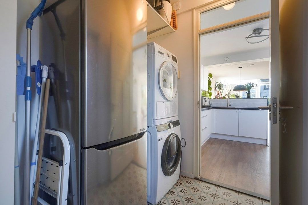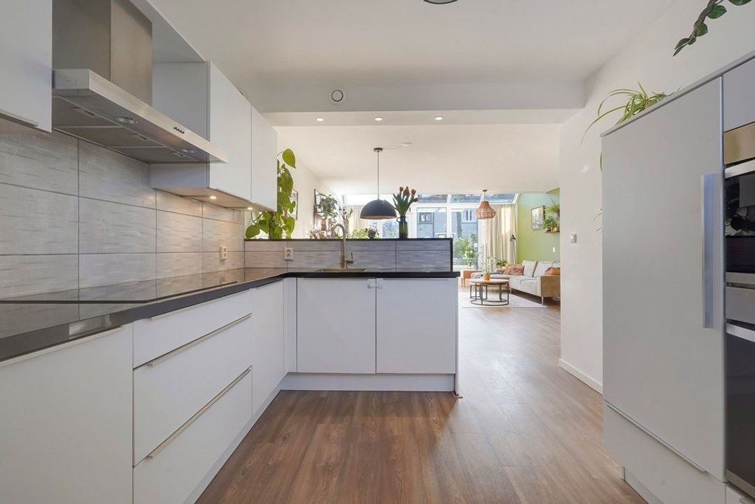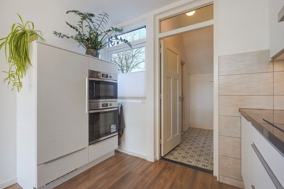 De open keuken heeft een moderne, rustige uitstraling en staat in directe verbinding met de woonkamer. De keuken is praktisch ingedeeld en voorzien van diverse inbouwapparatuur en veel werk- en opbergruimte. Aansluitend bevindt zich de bijkeuken met opstelplaats voor wasmachine en droger.