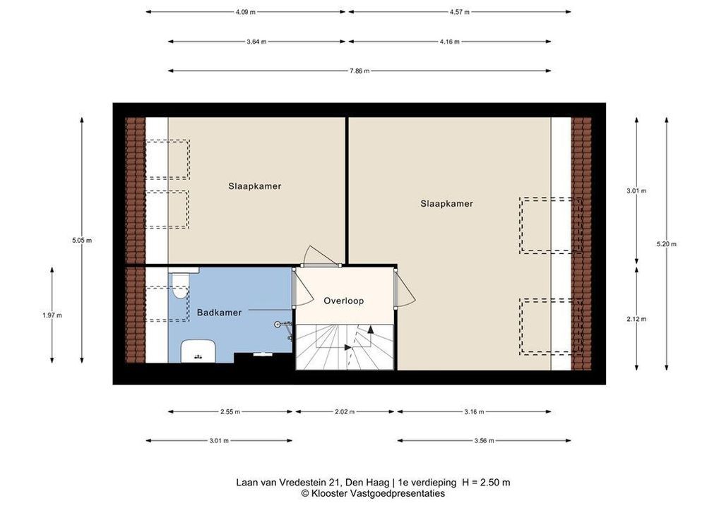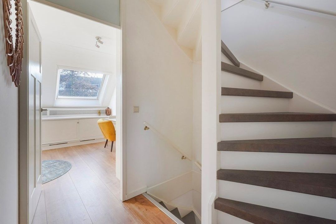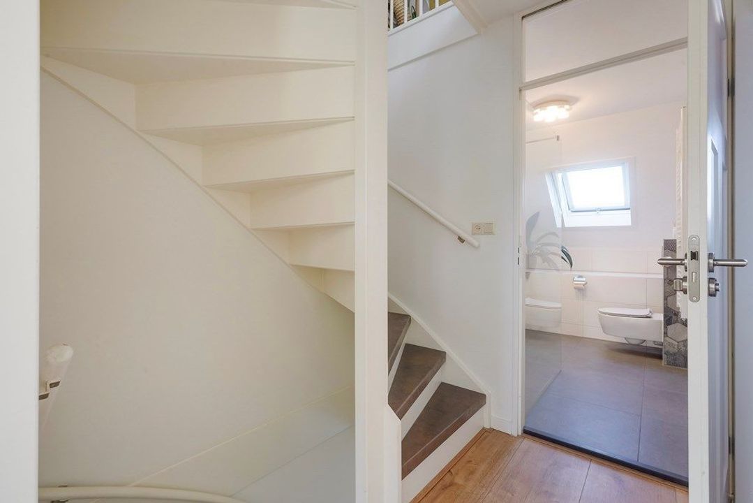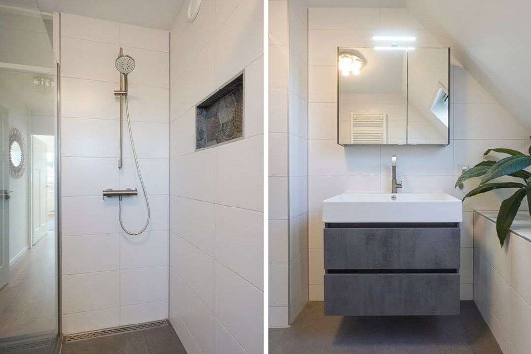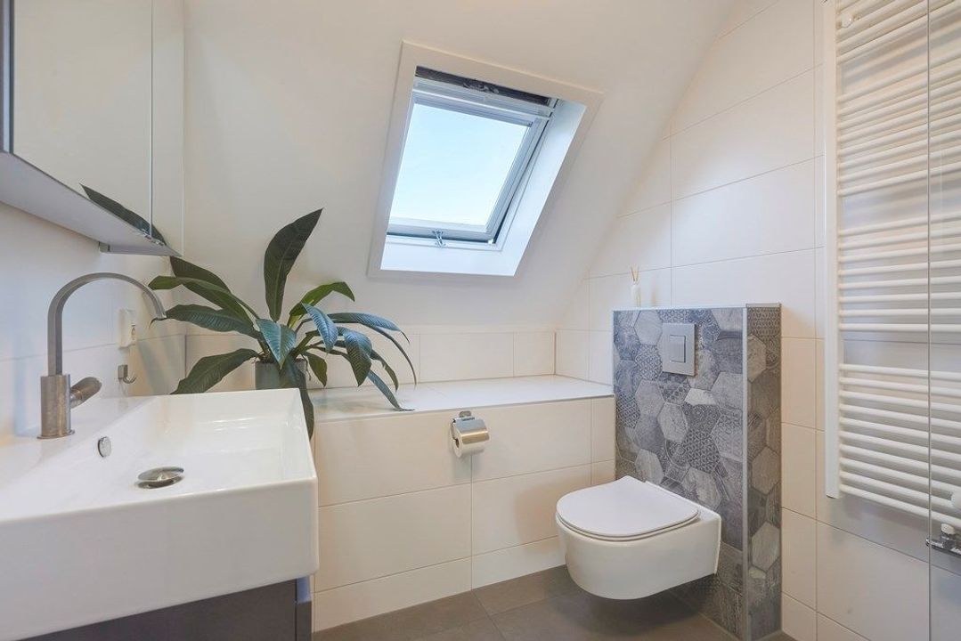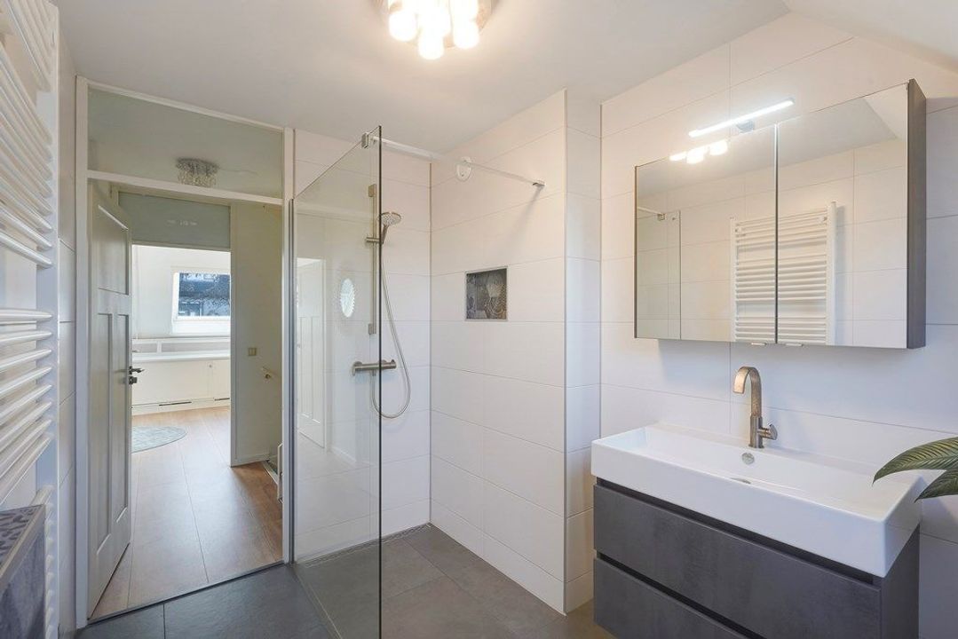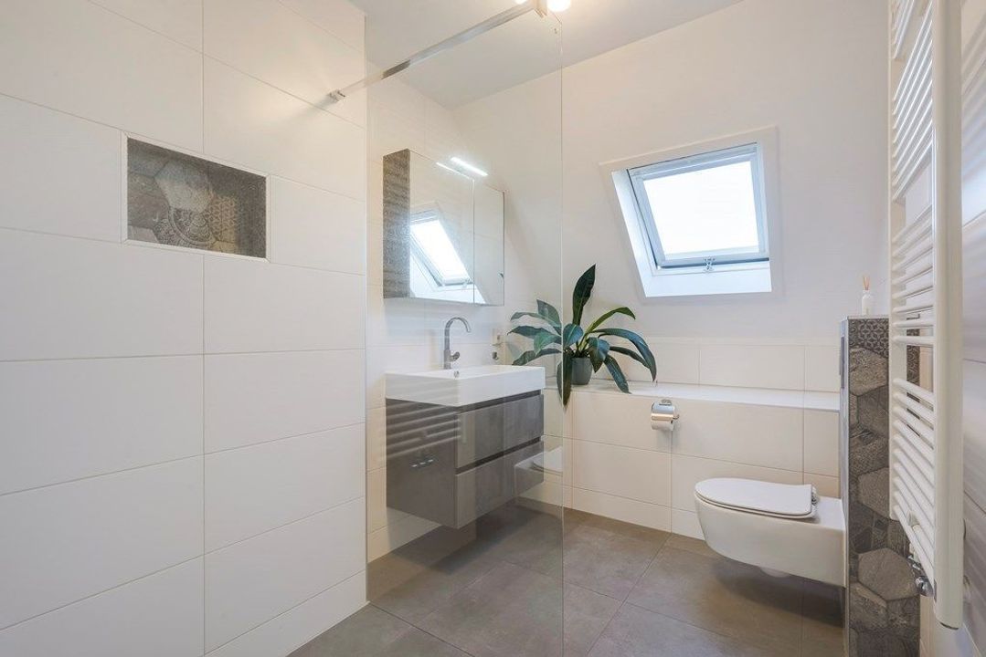 Overloop. Aan de achterzijde bevindt zich een lichte en ruime slaapkamer. De moderne badkamer is sfeervol en licht dankzij het dakraam en de rustige kleurstelling. De badkamer is voorzien van een comfortabele inloopdouche met glazen wand, een zwevend toilet en een stijlvol wastafelmeubel met spiegelkast. De nette afwerking en tijdloze materialen maken dit een prettige ruimte om de dag te beginnen of af te sluiten.