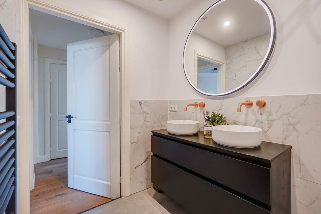 The luxurious bathroom is neatly and modernly finished and equipped with a walk-in shower, double washbasin unit and a designer radiator. In addition, there is a separate toilet and a practical storage room. The combination of authentic character, high-quality finishing and a quiet location makes this apartment an exceptionally attractive and comfortable place to live.