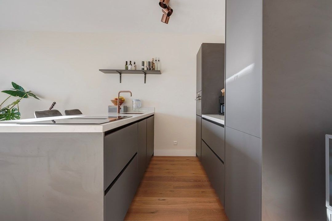 Entrance to the apartment. Spacious hallway providing access to all rooms. Generous and bright living/dining room with large windows allowing plenty of natural light, and a modern open kitchen with cooking island and wall units. The kitchen is fitted with a stone worktop, induction hob with integrated extractor, combination oven/microwave, fridge-freezer and dishwasher.