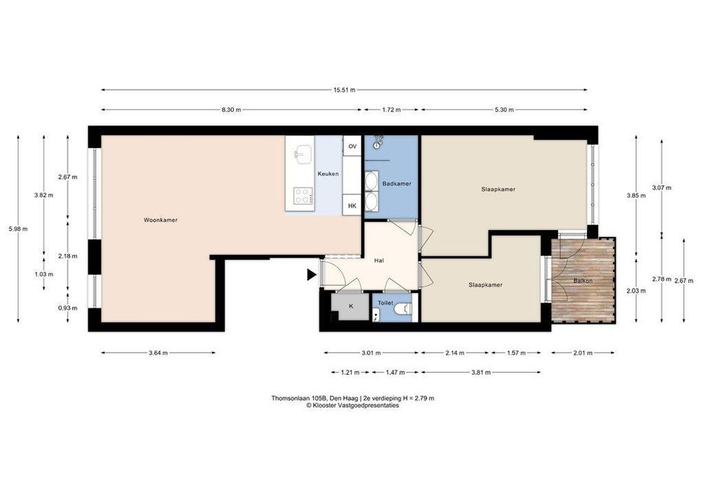 At the front of the apartment you will find the generous and beautifully bright living room with a modern open-plan kitchen — a pleasant living space where cooking, living and relaxing naturally blend. At the rear, the property features two spacious bedrooms, both with direct access to the sunny northwest-facing balcony. A wonderful spot to enjoy the afternoon and evening sun in peace and quiet.