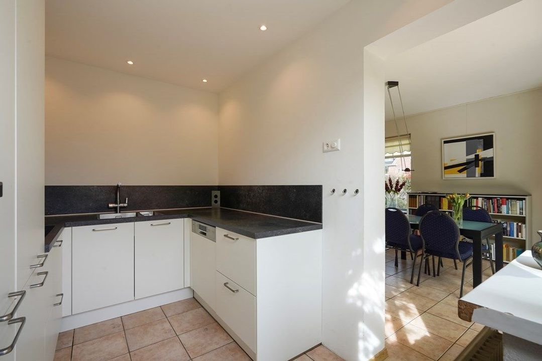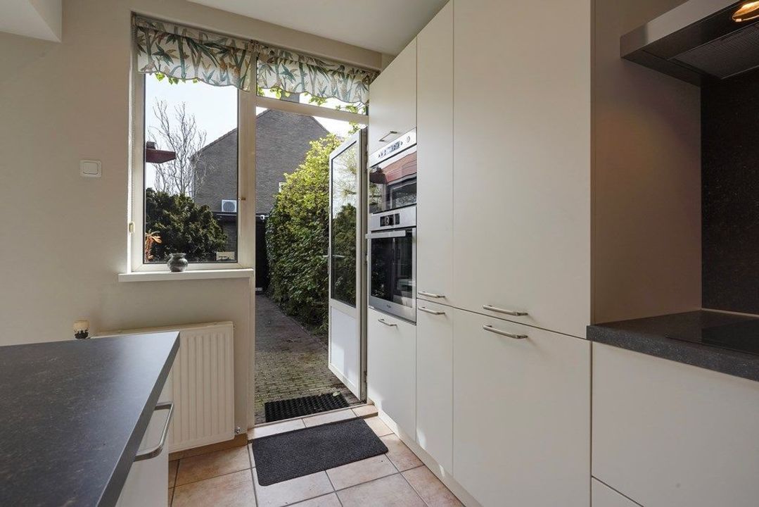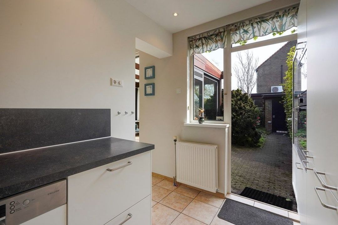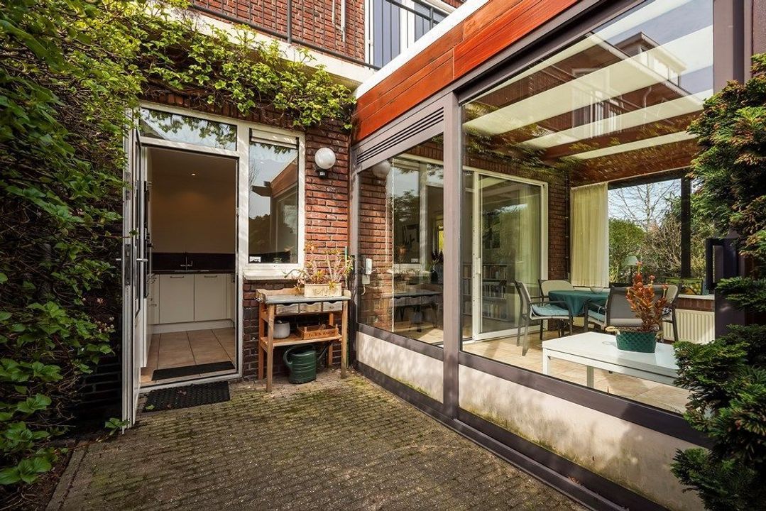 Entree via de hal met toegang tot het toilet, meterkast en trapopgang. Vanuit de hal bereikt u de lichte woonkamer, die dankzij de hoekligging een aangename sfeer heeft. Aansluitend bevindt zich de serre aan de achterzijde, die de leefruimte vergroot en een directe verbinding met de tuin biedt. De keuken is voorzien van een modern keukenblok met inbouwapparatuur en heeft eveneens toegang tot de tuin.
